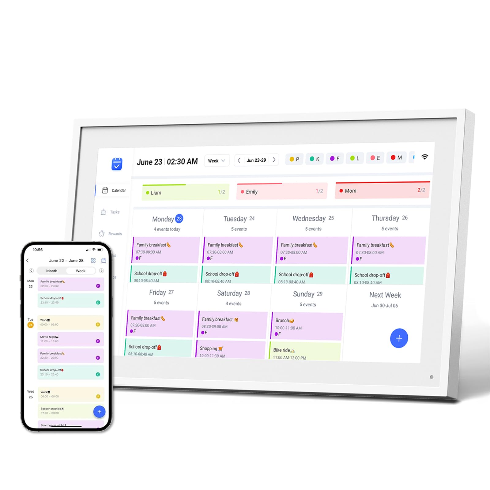 - DIGITAL CALENDAR & PHOTO FRAME 2-in-1 – Switch between a smart calendar and a digital photo frame with a tap. Sync photos, events, and memories via the app, and enjoy automatic updates across all devices—perfect for home and office use.